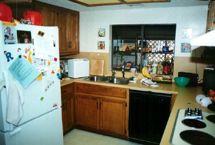 Refrigerator magnets, breadmaker, cutting board, dishes, windowbox clutter |