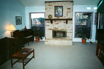 De-personalized (portrait over mantle changed), dynamized (plants added, generic arty objects on mantle, lamp adds warmth) |