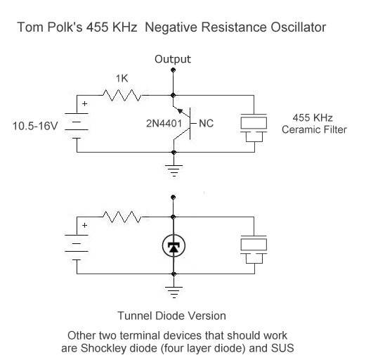 Output is taken off the emitter. The resonant device is a three terminal 455 KHz ceramic filter typically found in consumer radios. The input and output of the ceramic filter are tied together. The filter's center terminal (normally grounded) is connected to the current limiting resistor.