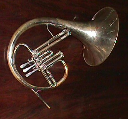 It is a descant horn. It it a type of french horn, but it is pitched an octave higher than the standard F horn. It looks skinny because it is half the length of a standard horn. Because it is pitched higher, the notes are farther apart than normal, making it very easy for the player to hit the desired note. In the lower range,this instrument sounds less like a french horn than a fluegelhorn. I worked at a musical instrument factory and from time to time they gave us scrap parts. The brass colored section is part of a trombone! |