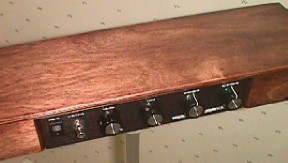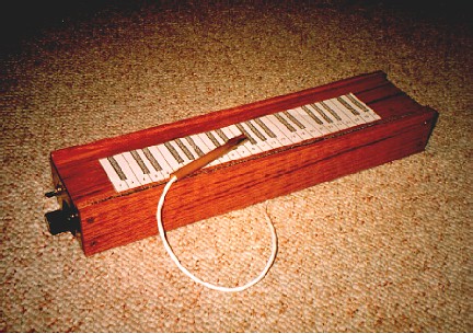 The pitch control is the knob at the paper keyboard, which exists only for letting the player know where the notes are. The volume knob is on the left end. The other controls select pitch range, waveform and master volume. I made this instrument for David Miller, who whetted my interest in putting one of these together. To learn more about this instrument, check out David's web page referenced at the left. |