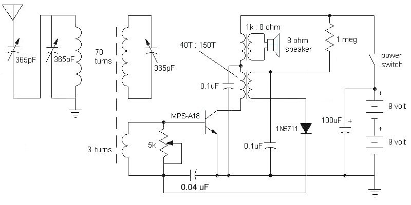 Antenna coil is contrawound 660/46 Litz on 4.5" dia styrene form. Tank coil is on 6" ferrite rod.