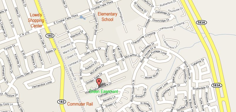 Soccer field and pavilion Walk to elementary school, no stop lights Shopping center caddy corner to neighborhood Commuter rail (park and ride lot) two lights up the road |
