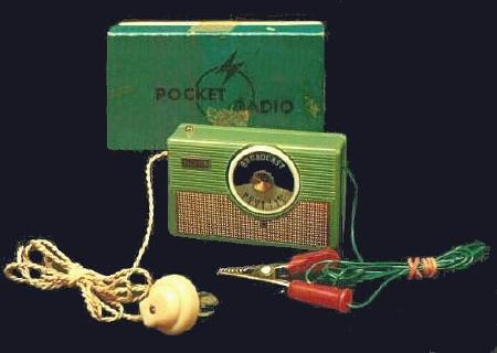 This 1959 Aud-Ion has only three parts inside. The rotating dial moves a cam that actuates an iron core within a coil, thus changing the tuning. There is no on-off switch or volume control. I remember clipping a radio like this to the bedsprings at night and listening to whatever KBYG had to offer, which wasn't much. |