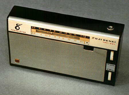 The leather case smells brand new, and it comes with a screw in antenna (note the jack at top right). The clean lines of this radio represents a departure from the campy 50s look just a few years earlier. The tuning dial, AM and SW (shortwave), is beautifully reverse painted. |