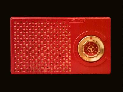 The world's first transistor radios were introduced around Christmas 1954. This GE Model 677 was introduced in 1955, along with its twin siblings 675 (white), 676 (black), and 678 (aqua). It uses a dual battery that would be strange today, 13.5 volts and 4.5 volts. It is designed to come apart easily, presumably for servicing. |