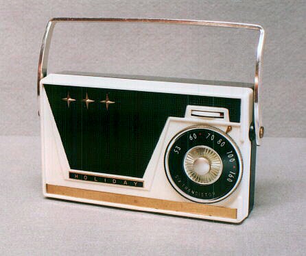 six transistor radio around 1957. It has two tiny red Civil Defense