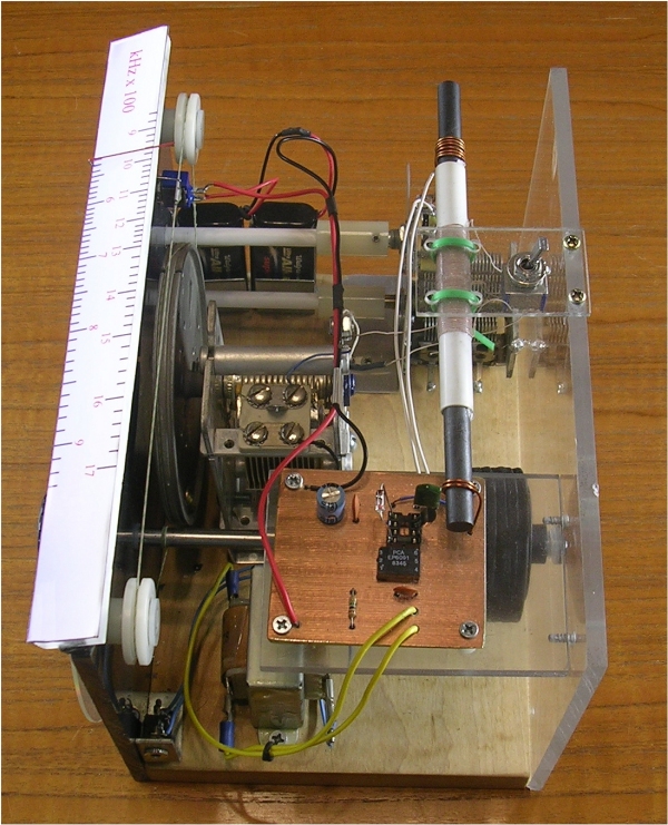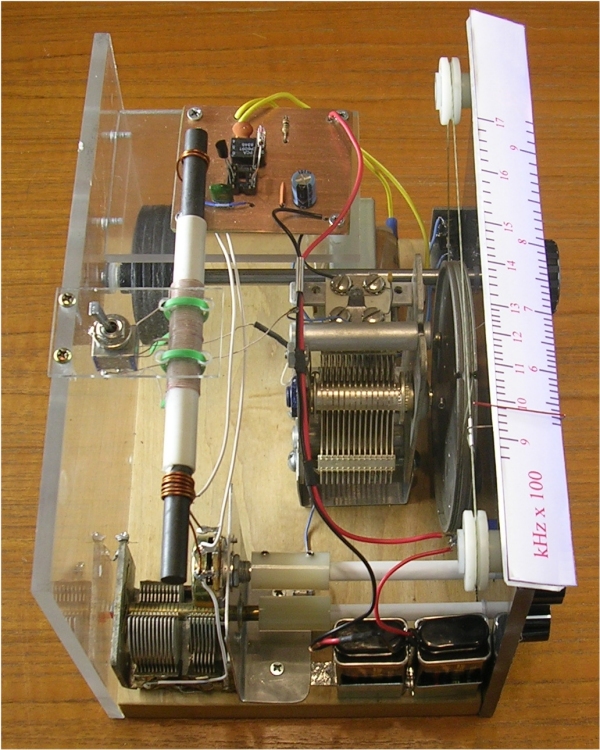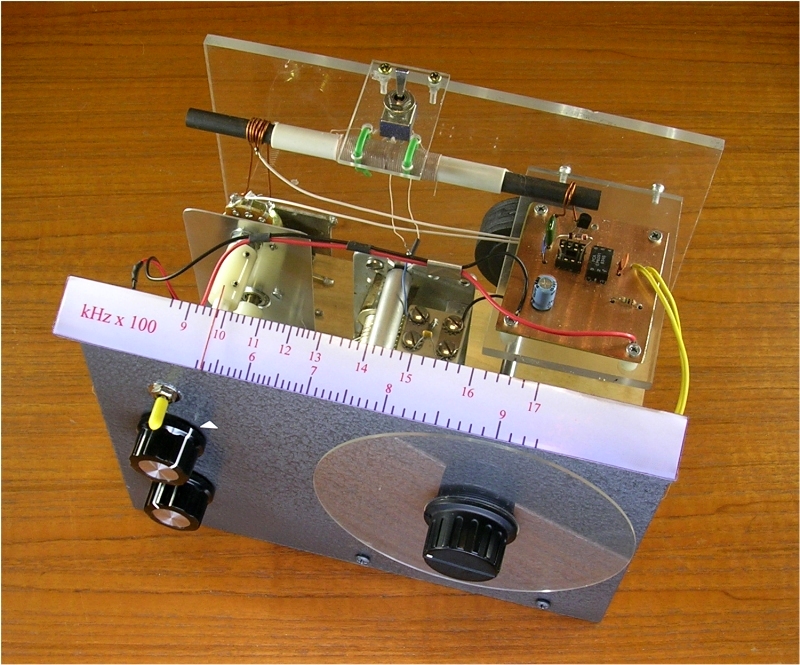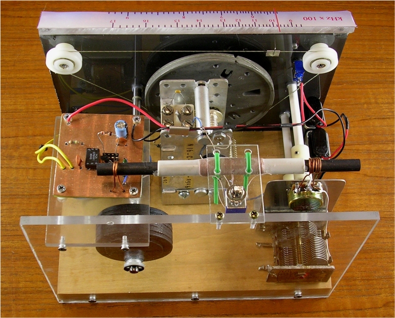 Tapped tickler coil provides both positive and negative feedback for wide range RF control; I've never seen this before and I'm very happy with how well it works Contrawound tuning coil provides dual range tuning for high Q and very fine control (silver switch next to tuning coil is range switch) High Q variable capacitor was intended to optimize performance; in fact, the radio can perform as well with an inexpensive poly capacitor 70 volt line transformer provides optimum matching for headphones or speaker Dial string tuning with 13:1 slow motion ratio aids in razor sharp tuning Heavy flywheel provides for buttery smooth action, a pleasure to operate Slide rule dial with 3/32" per 10 kHz at the upper end of the AM dial makes locating stations extra satisfying Eight pin IC socket permits easy substitution of transistors and diodes Previous version (not shown) used dual back-to-back diodes to smooth regeneration and control howling; not necessary with tapped tickler version Inexpensive shaft couplers made from hardware store nylon bushings and set screws Optional external antenna coupling using contrawound air core coil |