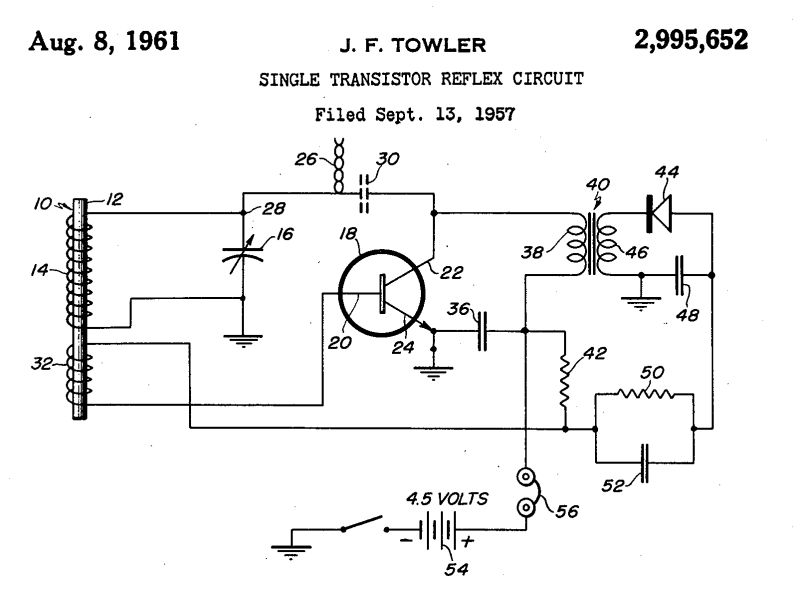 Shortly after I.D.E.A. Corp introduced the first transistor radio to the masses, the Regency TR-1, one of their following products was a single transistor reflex radio, invented by J. F. Towler. The following image is from his patent.