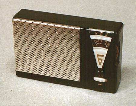 This model is notable for the V-shaped tuning dial and the grape colored tuning wheel. Four inches long, it is one of the first truly shirt pocket radios, unusually dainty for a horizontal radio.
