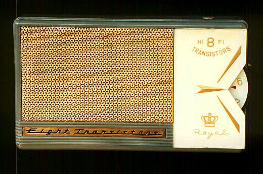 Reverse painting is a technique of applying paint on the backside of a clear coat of plastic for protection and 3-D beauty. Sometimes the sheen is reminescent of stained glass windows.. Notice the "V" shaped arrows and pointers, common in the late 50s-early 60s. Find more "V" examples here and here. Also common were regal names: Royal, Regency, Viscount, Coronet, King, and Crown. To see a stunning bright red variant of this radio, click HERE. |